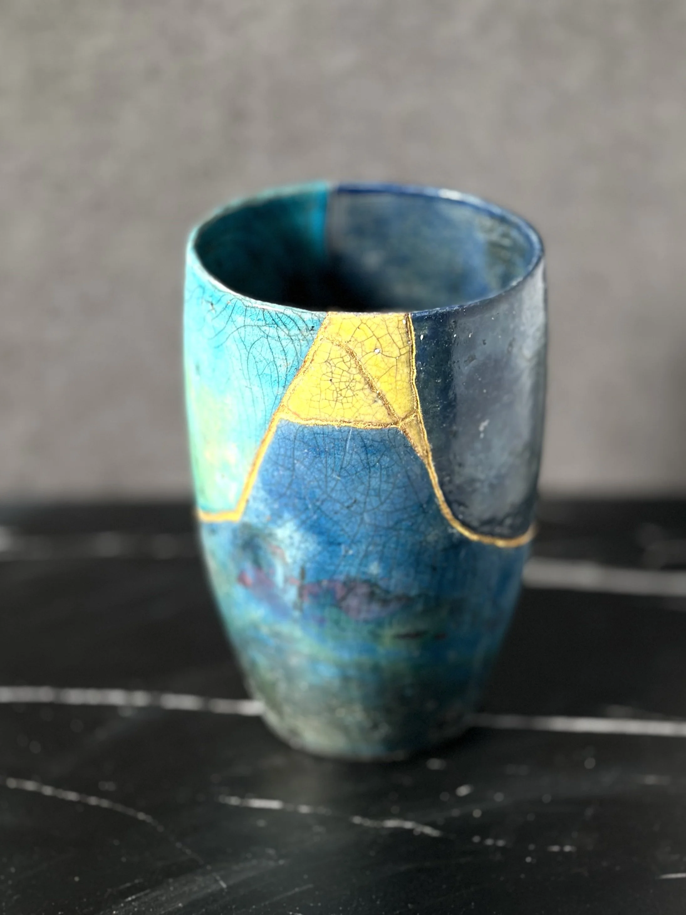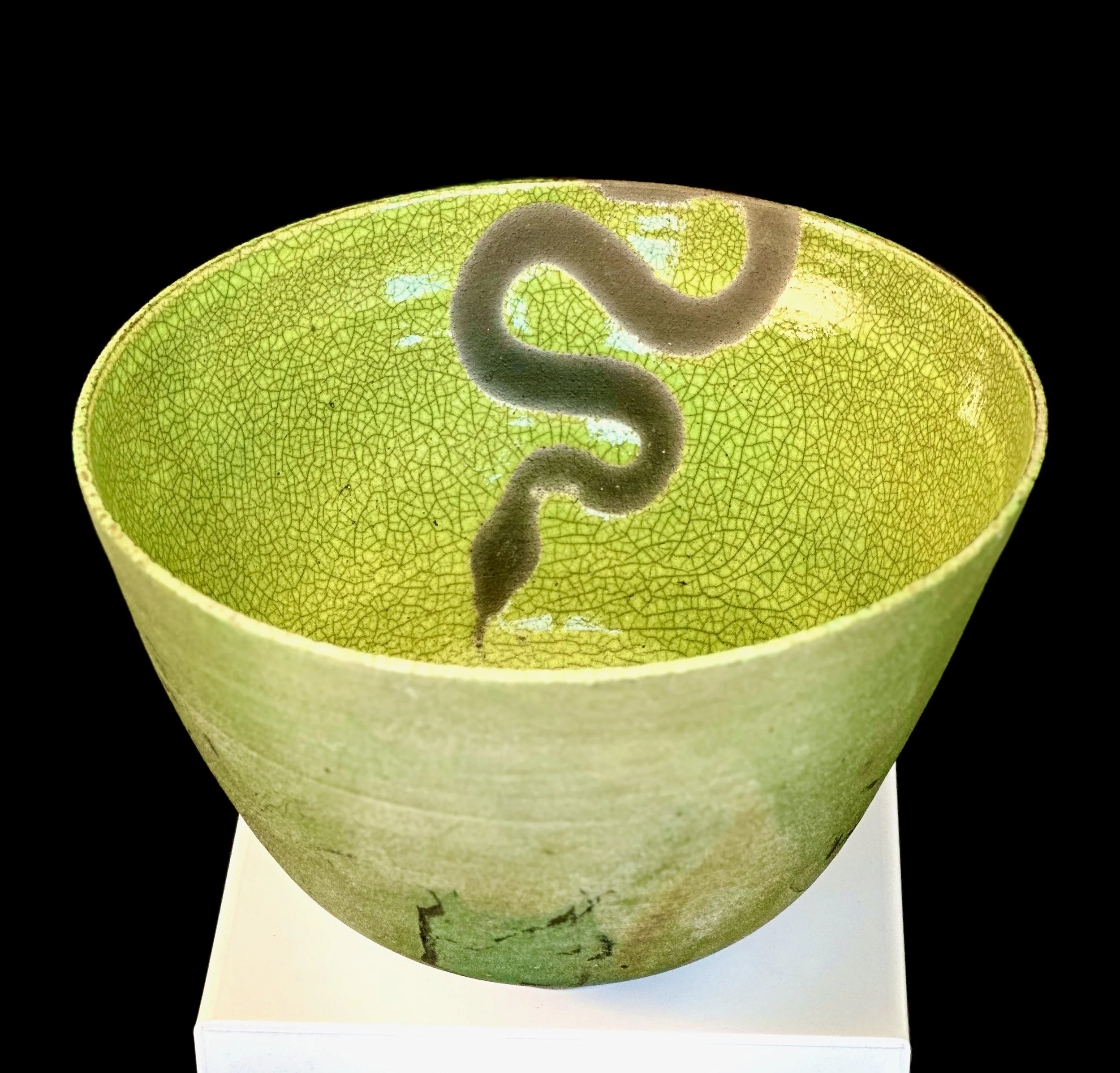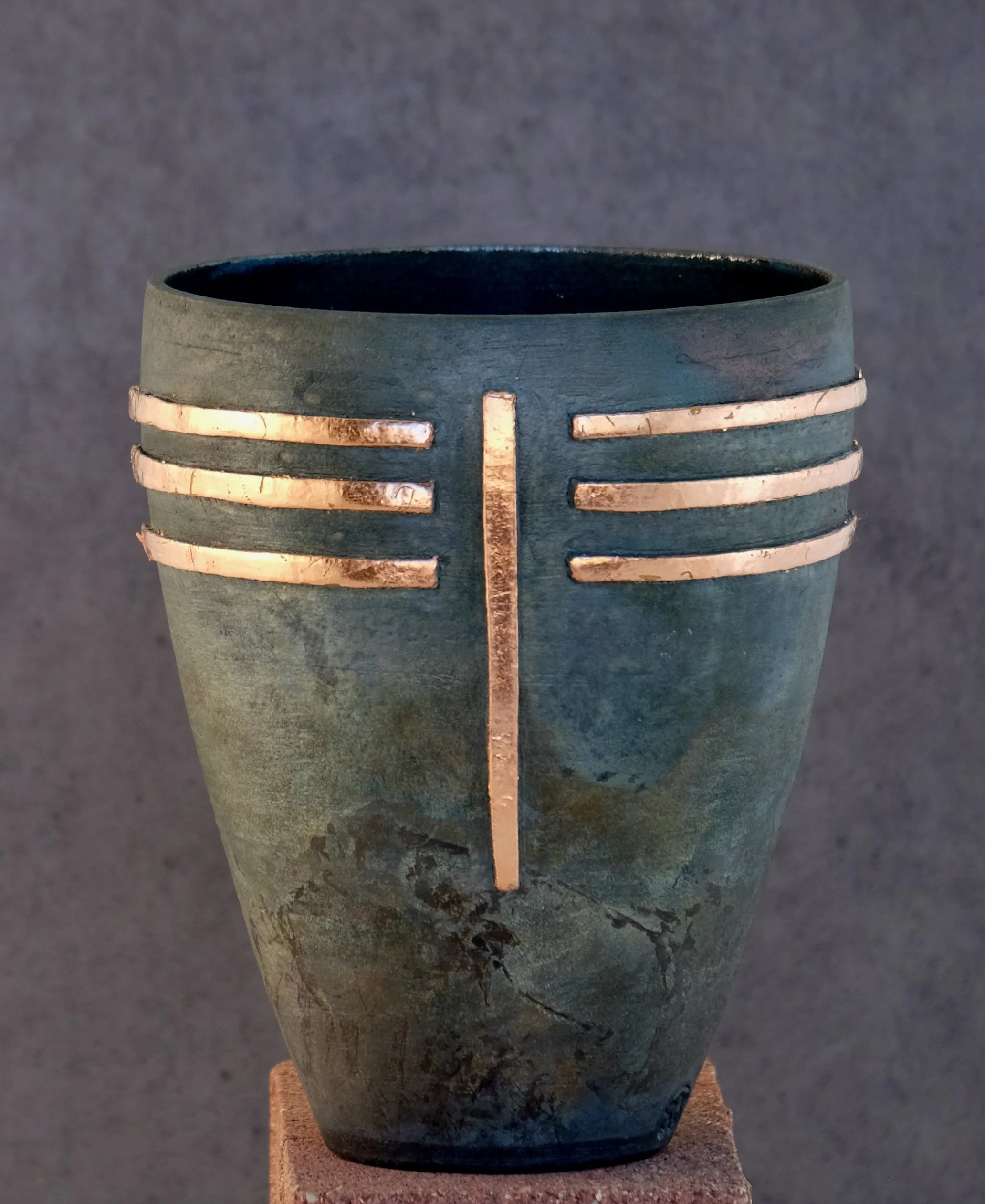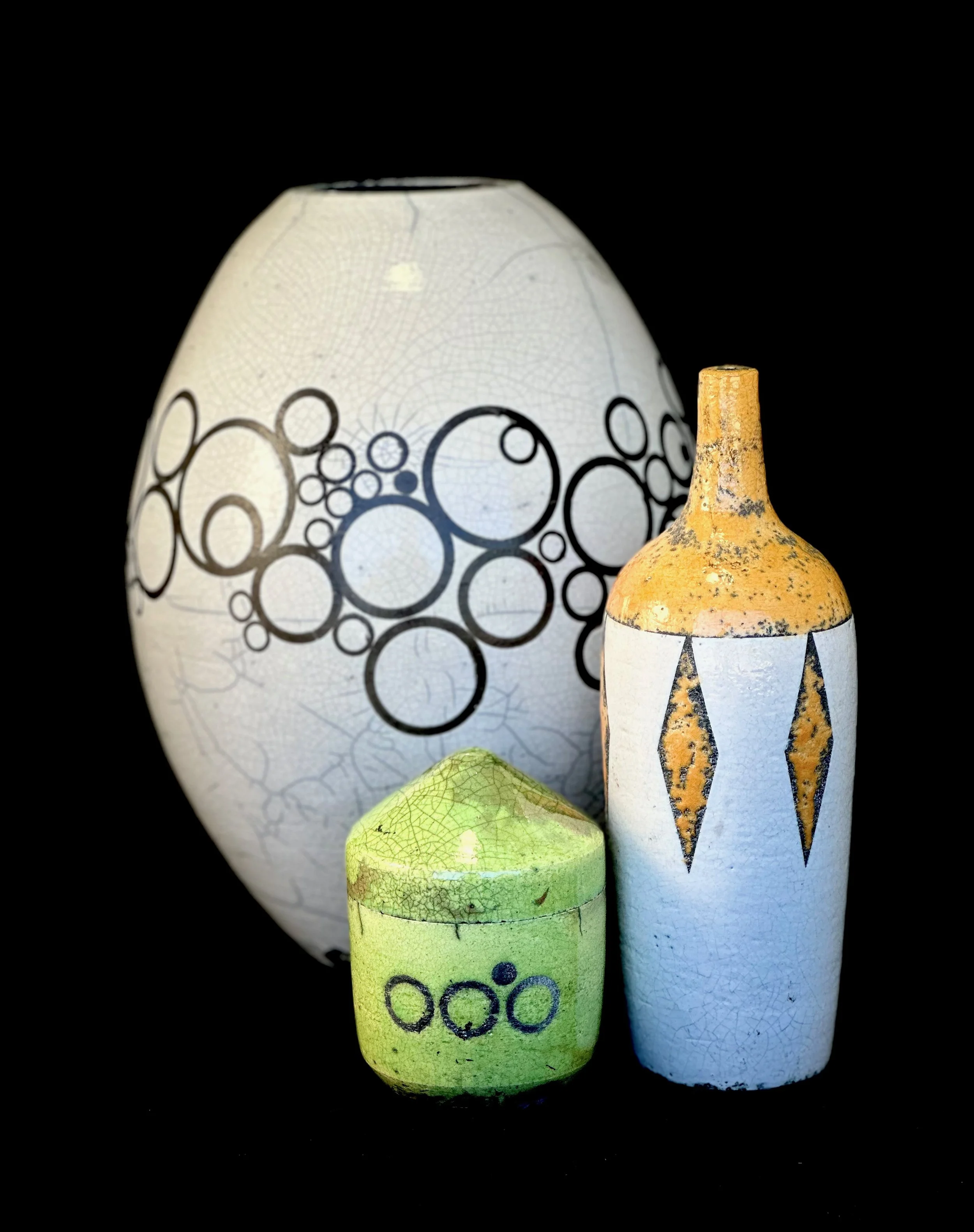 Fascinated by wheel-thrown pottery since age seven, I didn’t try it until sixty years later. It was love at first touch. I aim for an “un-modern” contemporary look, blending surface design, experimentation, and serendipity to create pieces that connect past and present through technique and expression.